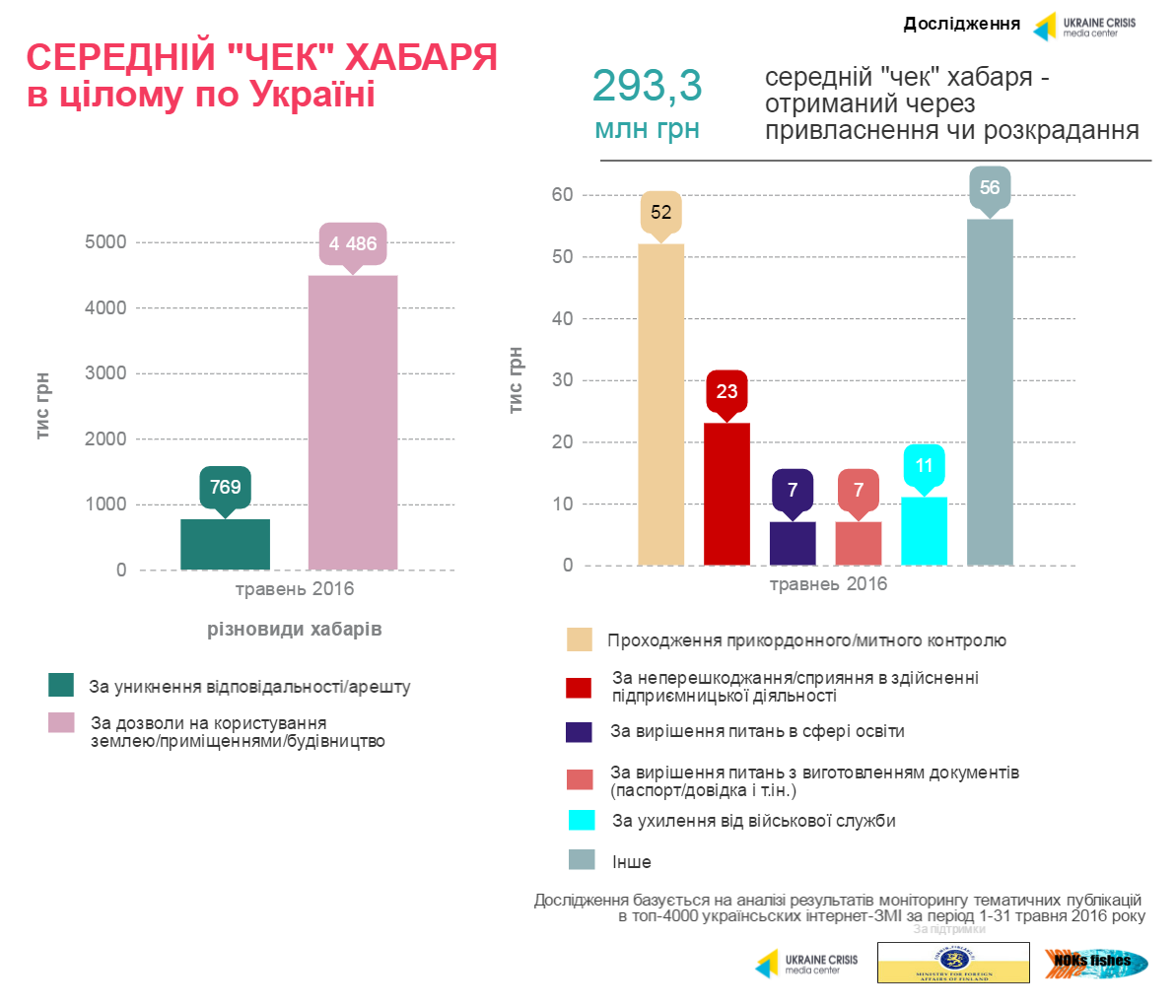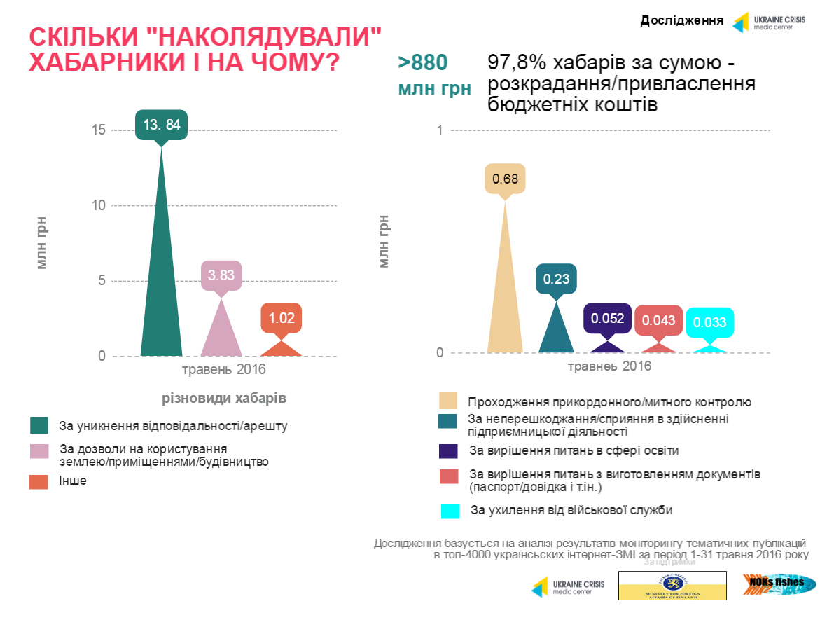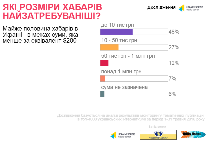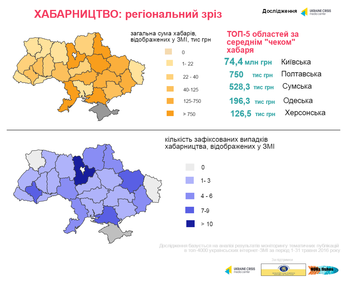 З точки зору висвітлення антикорупційної тематики загалом і хабарництва зокрема, лідирує Київ, що є прогнозованим. Київські журналісти звертаються до розслідувань фактів корупції (хабарництва) із середнім "чеком" на рівні 74 млн грн.